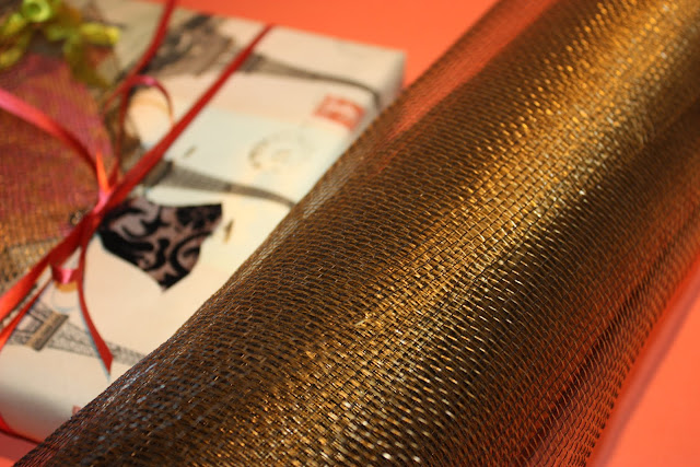 Once I found the gift wrap mesh that was hiding away in my supplies, the rest of the dress was easy to build. I simply cut leftover pink damask gift wrap paper to make the bottom skirt lining and the bodice is a wide black flocked ribbon, then took 3 tiered layers of the gold mesh and secured them with a pewter push clip. You begin carefully threading ribbon (the smoother the better) through the mesh holes at the bottom of each mesh layer (not too close to edge as it the mesh will pull apart) and let the ribbon pouf a bit as you move it along. You are moving the ribbon in the top and then under the mesh. In this case there is 3 mesh tiers, each each shorter and 3 layers of ribbons which gives the skirt volume. There is no precise measurement, you can play with any ribbon any way you like, as much or as little as you want. I used a 1/2" chartreuse satin, when I tried a wider version it pulled the mesh holes too far apart. I think I may have a solution to that problem but I will demonstrate on my next "dress embelishment" post. If it works.