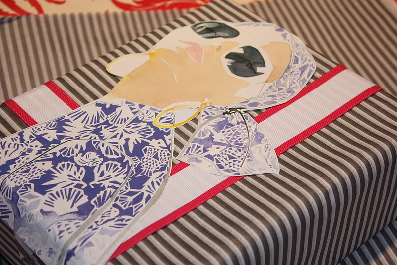 This makes me want to head where the sun shines bright and hot.....somewhere where you wear scarf turbans and cool cotton caftans. St. Tropez perhaps. When I received my Jo Malone refill order a few weeks ago there was a nice supply of gray and white stripe tissue that made me want to explore a more summery gift wrap presentation. Pinstripes always make me think of summer Once the tissue wrinkles were ironed out so easy I got going and by chance came across this fashionable Leggiadro illustration from a 2009 copy of Town & Country. Bonus.