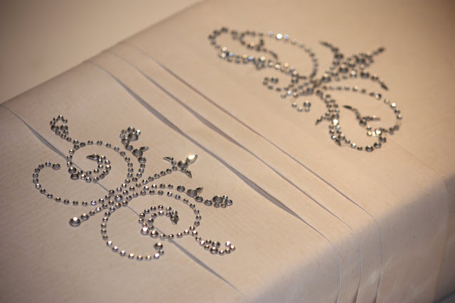 Since the paper is ivory I did think this monochromatic gift presentation needed a bit of definition so I used the leftover paper strip and folded it into pleats and used double-sided tape for the rear. Since the flourishes are on a clear backing I could easily see the position before removing and placing in the final position. These rhinestone flourishes are a decent size and certainly have the ability to bring sparkle and elegance to a gift with no ribbon. Feel free to leave comments for your summer camp counselor (me)........she wants to make sure you aren't bored.