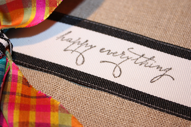 I was dying to use my new Besotted rubber stamps and just love this Happy Everything, I think it is my absolute favorite phrase. Since this ribbon is a grosgrain, the stamp image isn't as sharp but I love the result on this banded grosgrain.